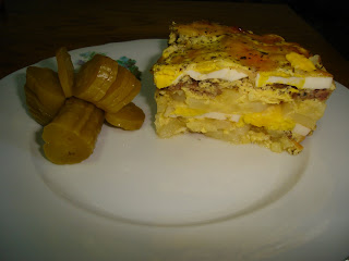 Ingrediente:3-4 cartofi o ruda de carnati de casa afumati 6 oua fierte 200 g telemea de vaca Pt. sos : 2 oua 150 g smanatana vegeta sare piper ierburi uscate (patrunjel, telina, busuioc) Pregătire:Cartofii se fierb in coaja. Dupa ce au fiert, se lasa la racit si se decojesc. Se taie carnatii felii, mai pe de-a latul sa fie felia mai lunga si ouale fierte la fel.Se pregateste un vas de yena si se unge cu margarina.Primul strat e de cartofi, deci taiati cartofii rondele si asezati-le cu...articol complet